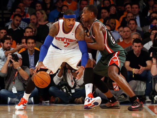 | Carmelo fez 36 pontos (17 no 4° quarto, com 60% FG) e... (Foto: USA Today) |
